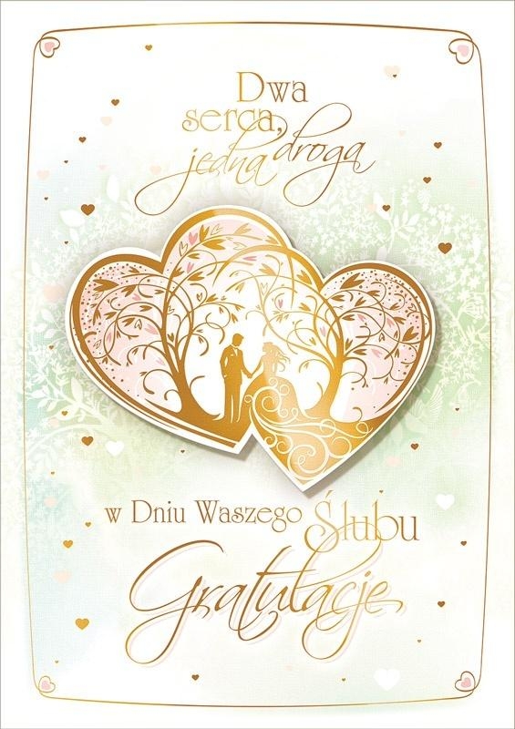 Karnet ślubny z kopertą, naklejane elementy, złocony, tekst życzeń w środku.
