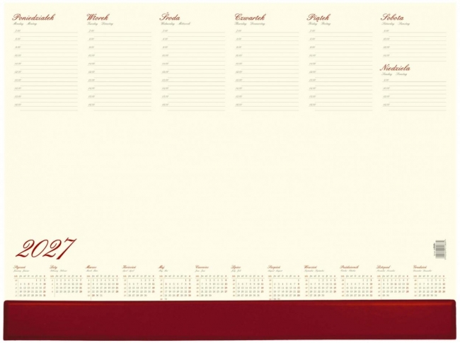 Elegancki podkład na biurko z dużym obszarem do notowania, drukowany na papierze kremowym. Uchylna listwa PCV w kolorze bordowym w dolnej części kalendarza. Na listwie istnieje możliwość wykonania nadruku reklamowego na obszarze 550 x 40 mm.