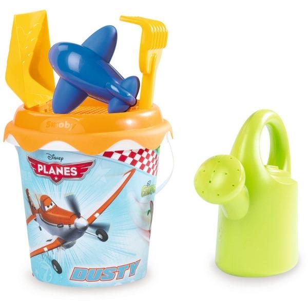 Wiaderko do piasku z motywami bajki Samoloty. Mały pomocnik będzie mógł do woli uprawiać ogródek, budować zamki z piachu czy pielęgnować roślinki za pomocą sympatycznej konewki. Dodatkowo w zestawie znajdują się następujące akcesoria: wiaderko, grabki, łopatka oraz foremka. IDEALNE NA PLAŻE I DO PIASKOWNICY.