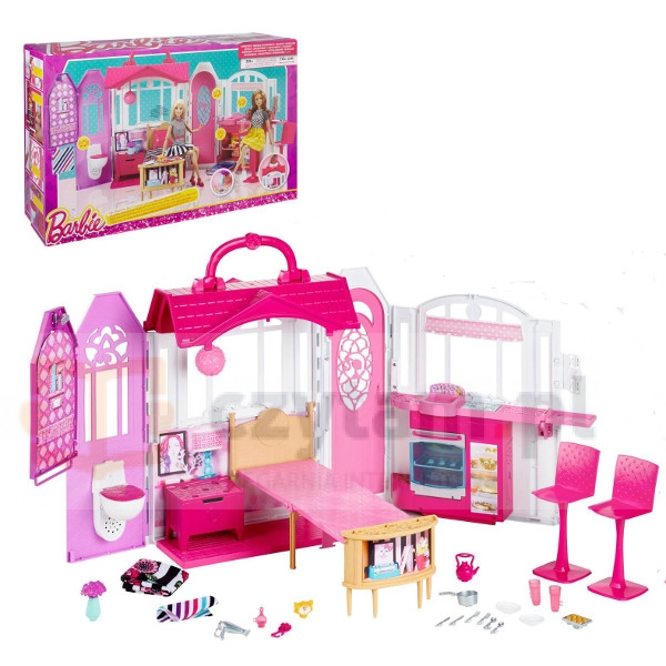 Ten niesamowity domek ze światełkiem i dźwiękami to doskonałe miejsce, w którym lalka Barbie może odpocząć i doskonale się bawić! Śliczny aneks kuchenny oraz urocza sypialnia z przylegającą do niej łazienką są urządzone w charakterystycznym stylu Barbie z nowoczesną nutką. Dziewczynki mogą zadzwonić dzwonkiem do drzwi (naprawdę działa!) i wkroczyć do zabawy! Lalka Barbie może przygotować posiłek na kuchence i zjeść go przy blacie, siedząc na jednym z dwóch dołączonych taboretów. Dźwięk czajnika i światełko w piekarniku dodają zabawie smaczku. Akcesoria takie jak dzbanek do herbaty, rondelek i talerze zapowiadają ucztę dla wyobraźni. W celu zwiększenia komfortu zabawy elementy skonstruowano tak, aby pozostawały w miejscu po włożeniu w ozdobne rowki. W sypialni znajduje się wygodne łóżko i stoliczek, a w łazience toaleta, prysznic i wieszak z ręcznikiem. Toaleta wydaje prawdziwy odgłos spłukiwania! Lalka nie znajduje się w zestawie. Domek posiada wygodny uchwyt do przenoszenia.