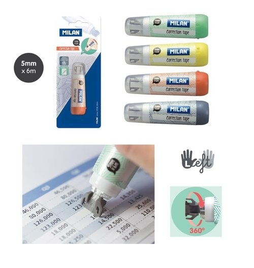 Korektor MILAN w taśmie - suchy system korekcji. Szybki, czysty i dokładny. Korekcja na wszystkich rodzajach papieru. Dzięki obracanej głowicy idealny dla osób leworęcznych. Szerokość 5mm x długość 6 m