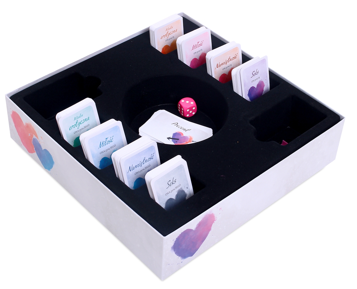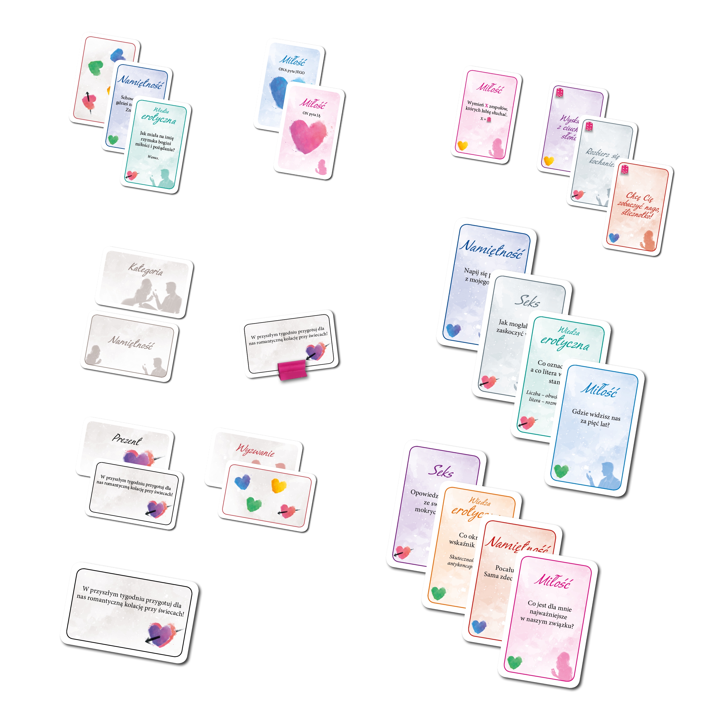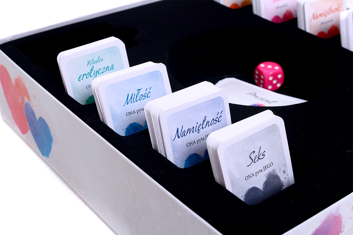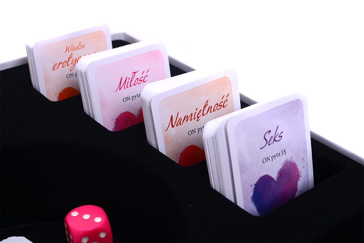 - Podzielcie karty na dwa stosy (z pytaniami dla NIEJ i dla NIEGO), a następnie podzielcie karty z każdego stosu według kategorii (MIŁOŚĆ, SEKS NAMIĘTNOŚĆ i WIEDZA EROTYCZNA). Wylosujcie też po 3 karty prezentów i wybierzcie z nich po jednej. Każde z Was niech wylosuje po jednej karcie wyzwania.