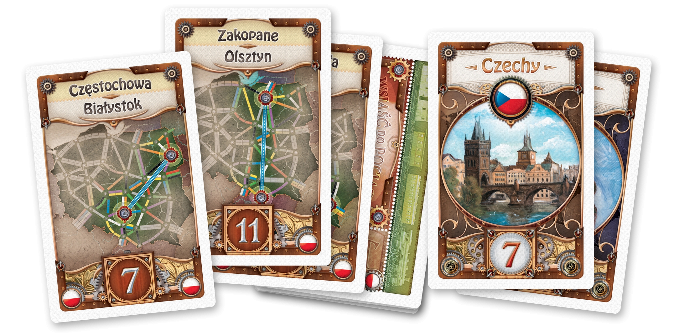 - Podczas gry uczestnicy dobierają kolorowe karty wagonów. Stanowią one walutę, która pozwala nam budować odpowiednie odcinki między miastami. Przykładowo aby wybudować trasę między Płockiem a Kaliszem potrzebujemy trzech pomarańczowych kart, a między Gdańskiem a Olsztynem – trzech czarnych.