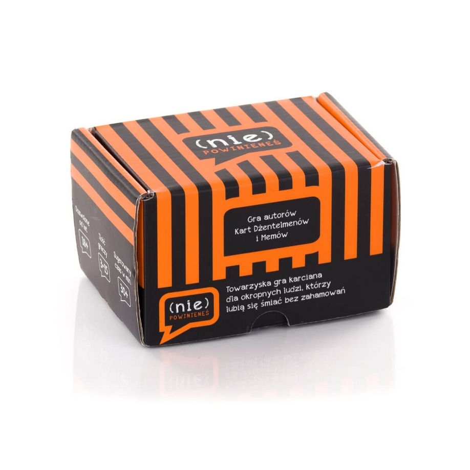 (Nie)Powinieneś to imprezowa gra karciana dla okropnych ludzi, którzy lubią się śmiać bez zahamowań! W każdej kolejce jeden z graczy czyta pytanie z czarnej karty a pozostali gracze odpowiadają za pomocą najzabawniejszej pomarańczowej karty.