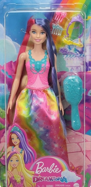 Lalka Barbie Dreamtopia Syrena lub księżniczka z długimi włosami. Opakowanie zawiera szczotkę oraz akcesoria do włosów. Zabawka odpowiednia dla dzieci powyżej trzeciego roku życia.