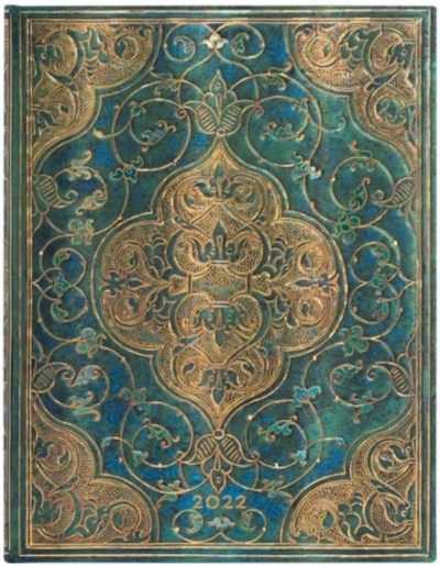 Kalendarz na rok 2022, 12-miesięczny ULTRA z kolekcji ekskluzywnej marki Paperblanks. Piękna okładka inspirowana jest oprawą książki Sall'a Binder'a "Chroniques" z 1514 roku, misterny wzór ukazuje renesansowe podejście do dekoracji. W środku znajdziemy miejsce na codzienne wpisy, notatki, planery, dwie satynowe wstążki, mini kalendarze, międzynarodowe numery kierunkowe, miejsce do wpisania swoich ważnych numerów, oznaczone wybrane święta międzynarodowe i wiele innych przydatnych informacji. Format Ultra typu Horizontal - rozplanowany cały tydzień na 2 stronach. Opisy są w języku angielskim. Kalendarz posiada 160 zszywanych stron, format 180x230mm, gramatura 100 gsm. Oprawa twarda. Na końcu po wewnętrznej stronie okładki jest koperta na luźne notatki lub wizytówki. Zamknięcie na gumkę.